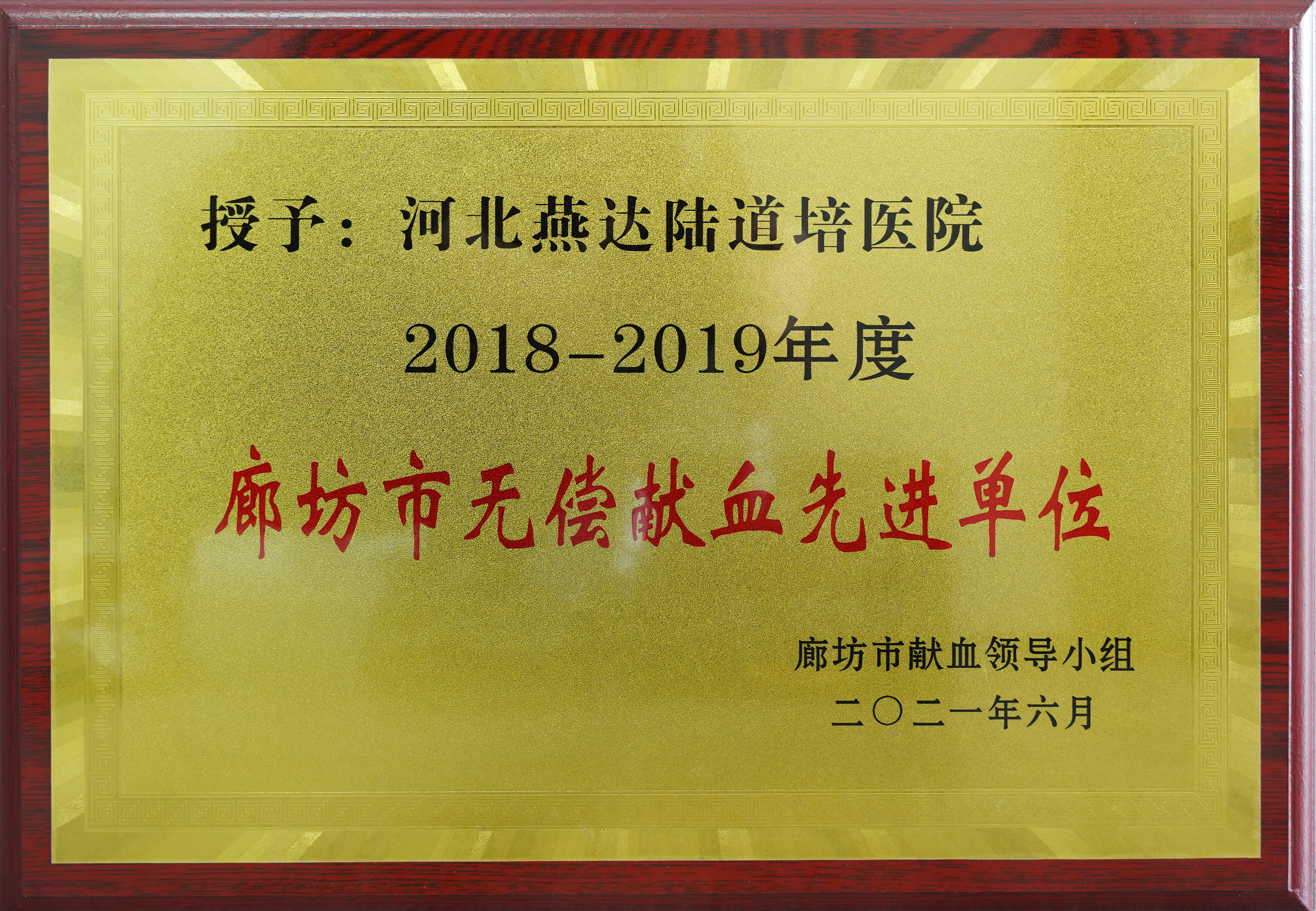 經(jīng)廊坊市獻(xiàn)血領(lǐng)導(dǎo)小組評(píng)定,授予燕達(dá)陸道培醫(yī)院“2018-2019年度廊坊市無償獻(xiàn)血先進(jìn)單位”光榮稱號(hào)。