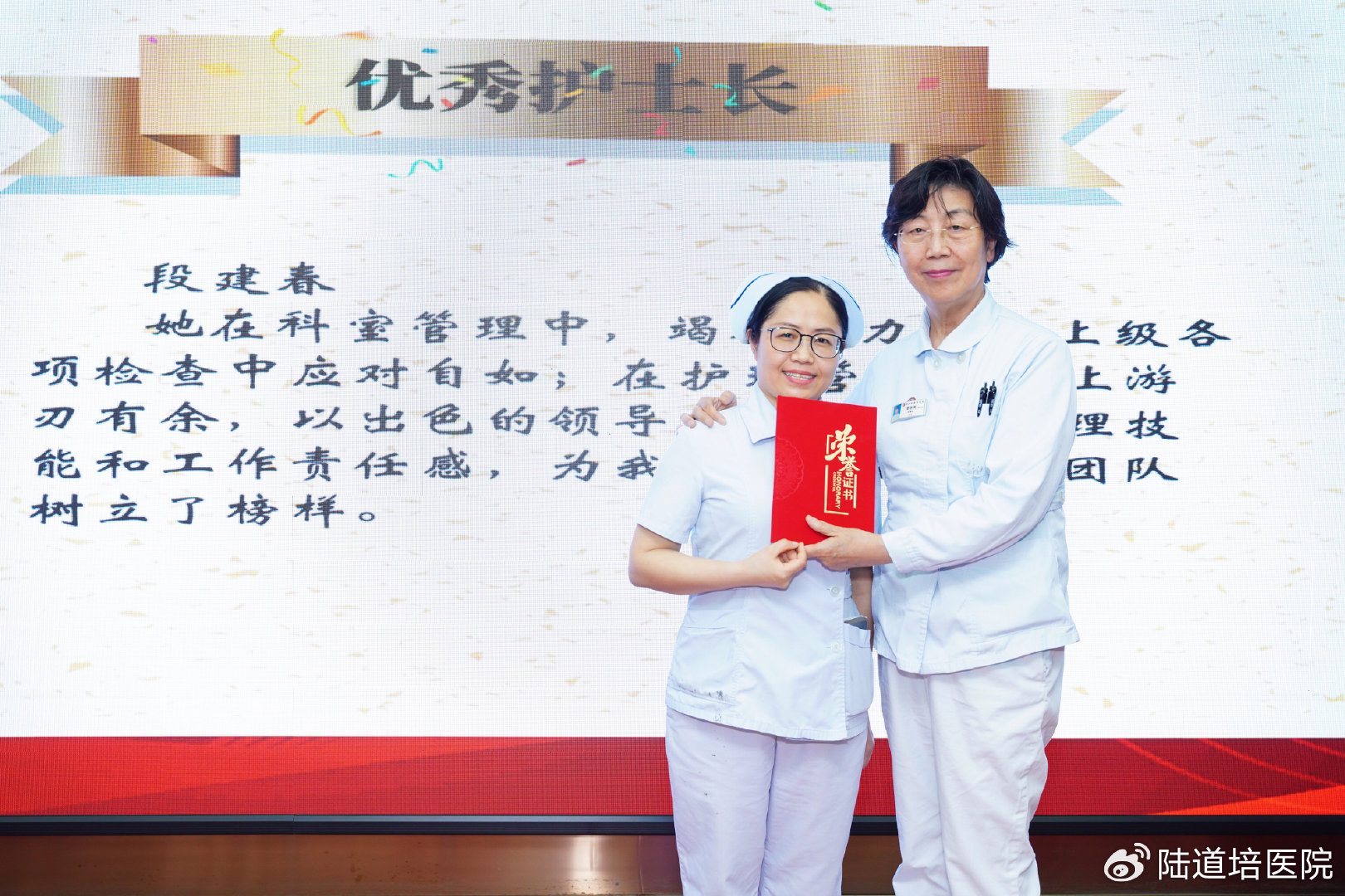 李學英主任為獲得“2024年度優(yōu)秀護士長”榮譽的移植科九病區(qū)段建春護士長頒獎——