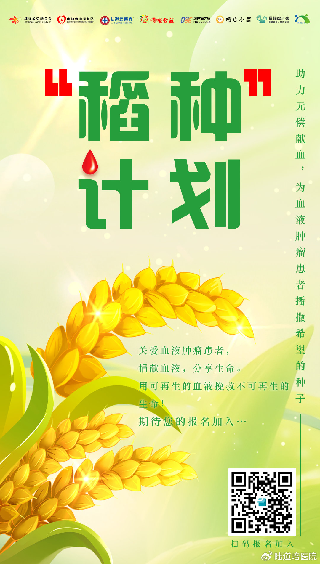 在第20個(gè)世界獻(xiàn)血者日來(lái)臨之際,為緩解臨床用血緊張,積極響應(yīng)世界衛(wèi)生組織關(guān)于獻(xiàn)血者日的號(hào)召,進(jìn)一步推動(dòng)無(wú)償獻(xiàn)血事業(yè)的發(fā)展,陸道培醫(yī)院聯(lián)合廊坊市中心血站、紅棉公益基金會(huì)、晴暖公益及血液腫瘤患者組織淋巴瘤之家、暖白小屋、骨髓瘤之家和血液系統(tǒng)疾病患者組織卡斯特曼之家一起組織發(fā)起“稻種計(jì)劃”,開(kāi)展主題為“助力無(wú)償獻(xiàn)血,為血液腫瘤患者播撒希望的種子”的無(wú)償獻(xiàn)血日活動(dòng)。